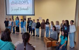 A délelőtti program a Neudörfl-i iskolában zajlott, ahol a résztvevőket Dieter Posch polgármester és Karin Sinawehl igazgatónő köszöntötte. A vendégek megismerkedhettek az iskola modern, tanári elképzelések alapján kialakított tereivel, Neudörfl városával, valamint közös éneklés és iskolabemutató videó is színesítette a délelőttöt. A jó hangulatú „Speed-Dating” program a tornateremben és a közös barkácsolás az iskola műhelyében segítette a diákok közötti ismerkedést.